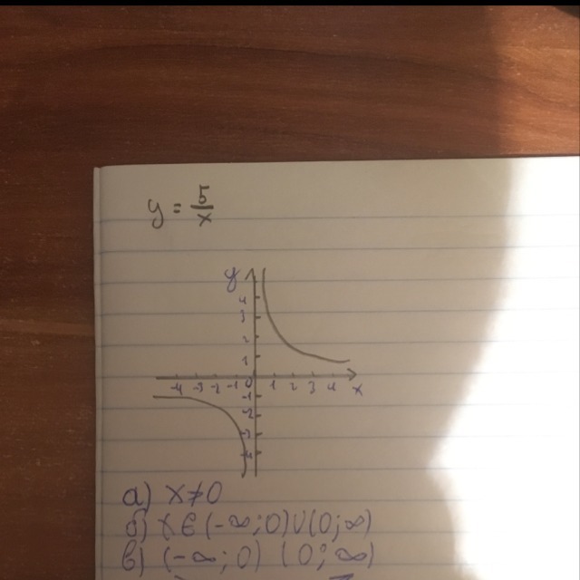 постройте график функции:у=5/х.укажите а)область определения функции,б)область значения функции,в)промежутки возрастания и убывания,