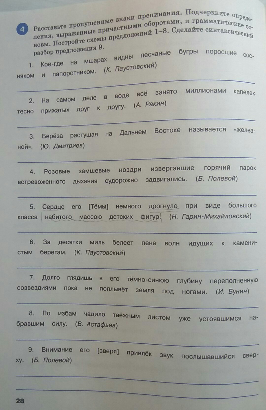 5. ...класса, набитого массою детских фигур. Прич.оборот: набитого массою детских фигур. Схема: волнистая линия, пунктир, волнистая линия, пунктир.
