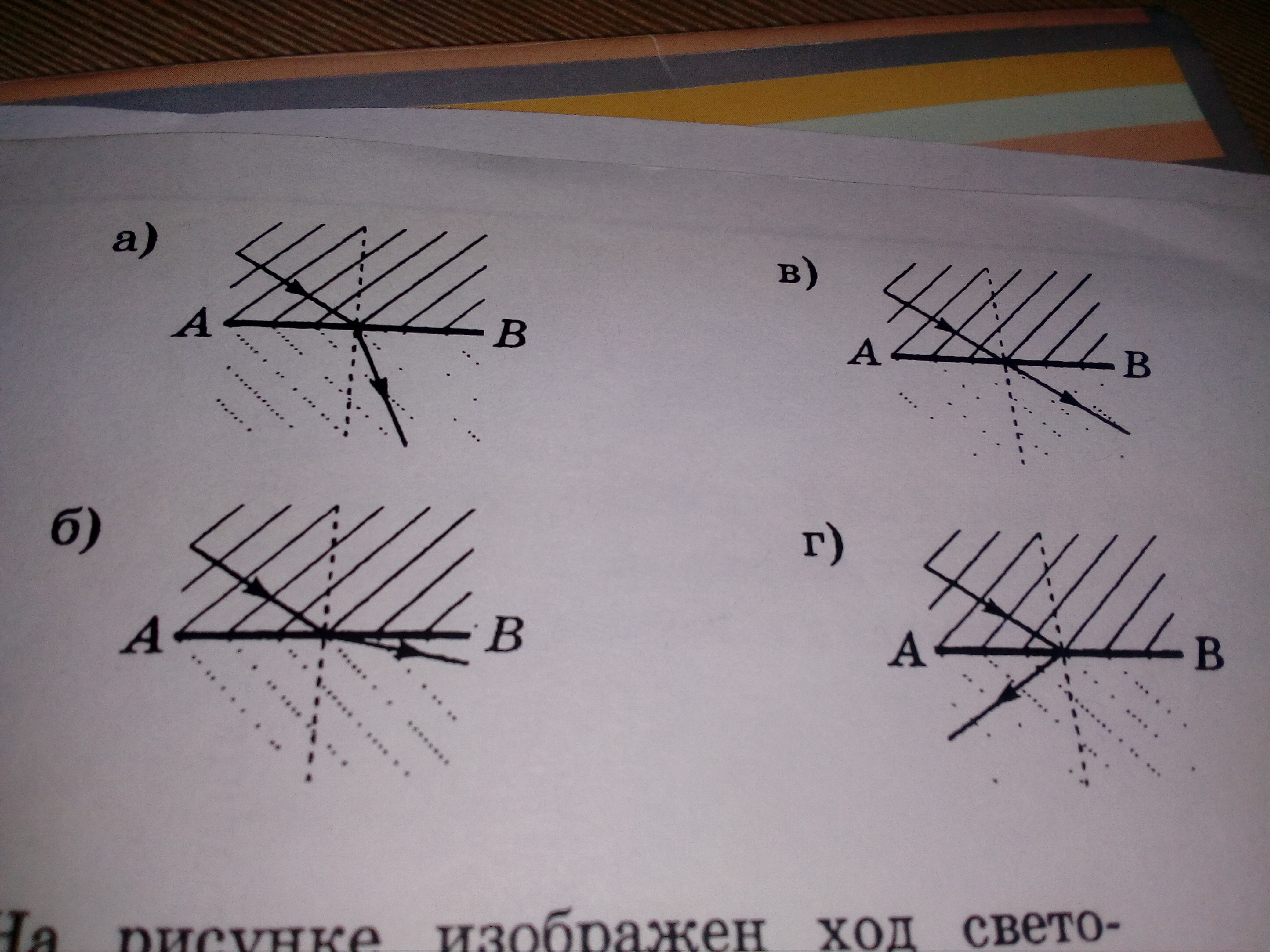 Рис.2: на каком из рисунков показан переход светового луча из оптически более плотной среди в оптически менее плотную среду? АВ- граница раздела двух сред.