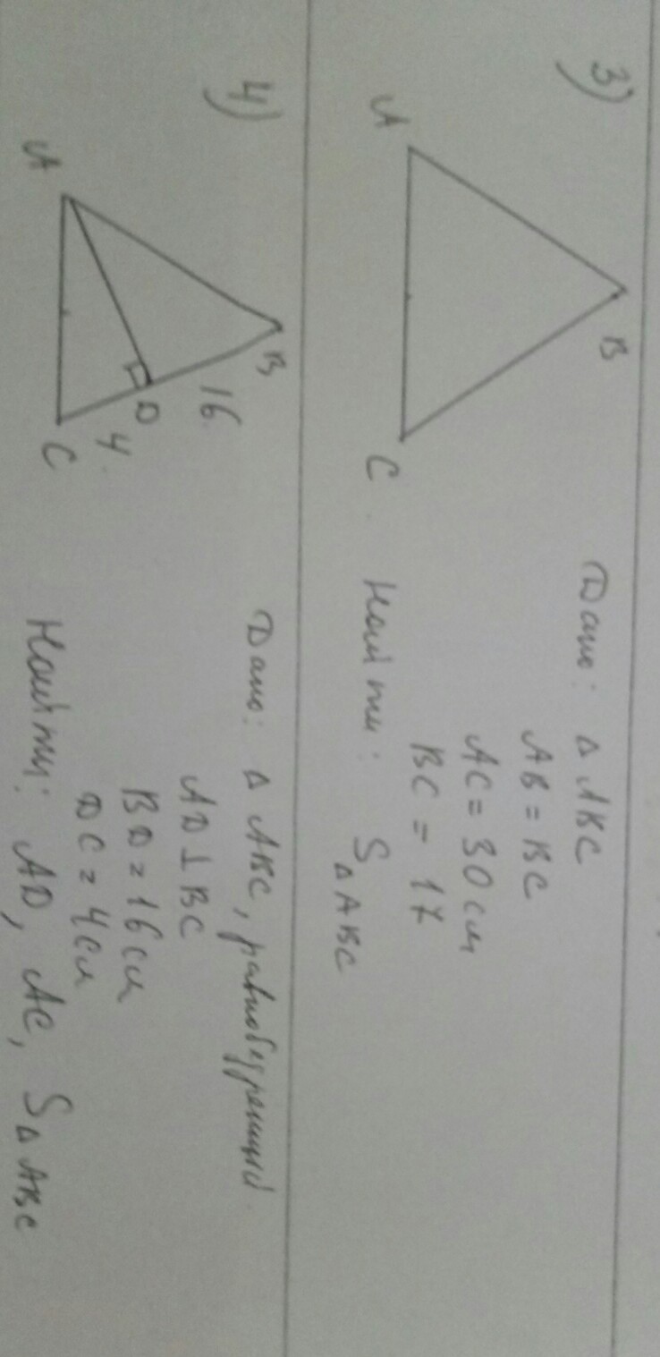 там аб=бс выходит что ac 30, bc 17, ab 17 (всё дано теперь ищи площадь