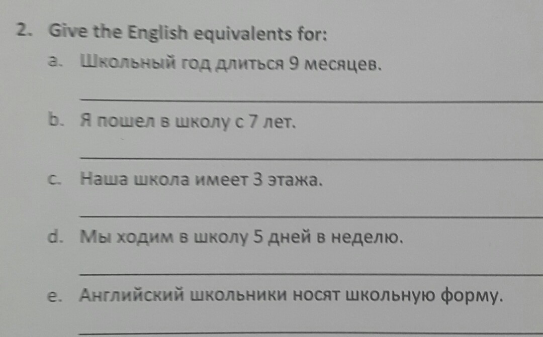 a) the school year lasts 9 months b) I went to school with for 7 years с) our school has 3 floors d) we go to school 5 days a week e) English pupils wear a school uniform