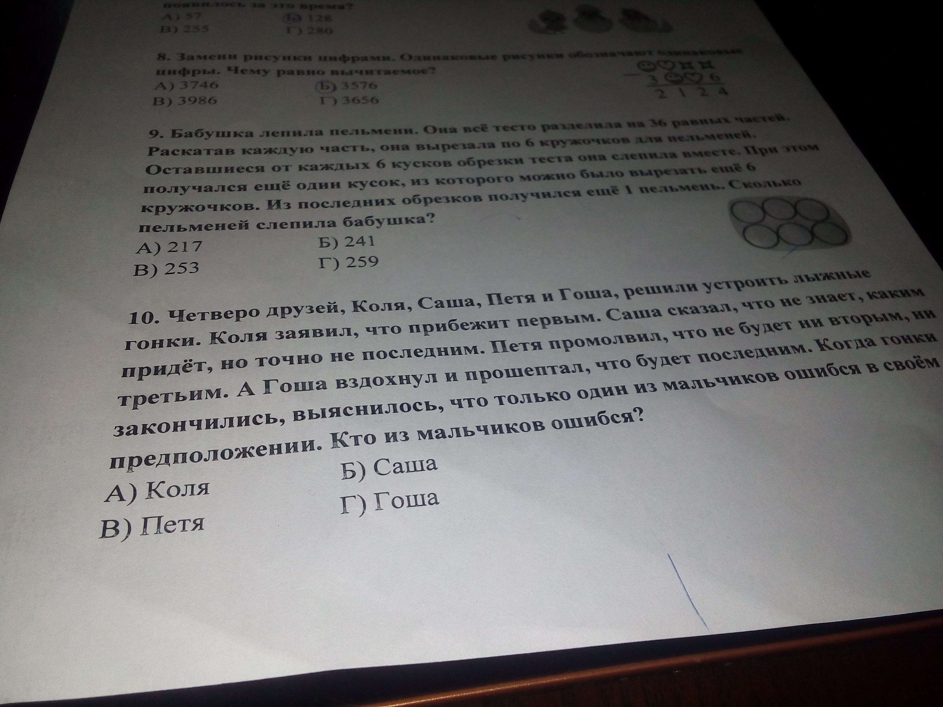 Если ошибся Петя, то Коля пришёл первым, Гоша последним, а Саша и Петя заняли второе и третье места.
