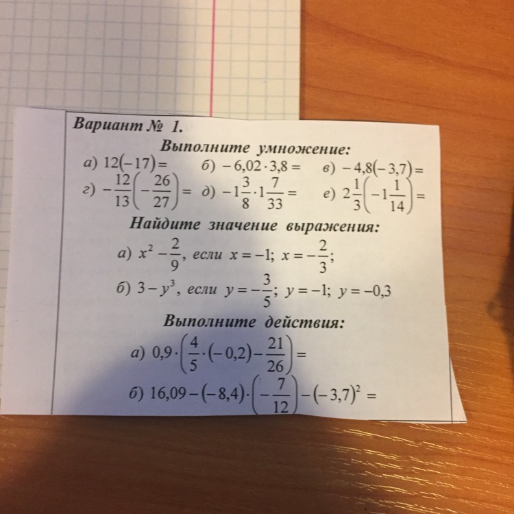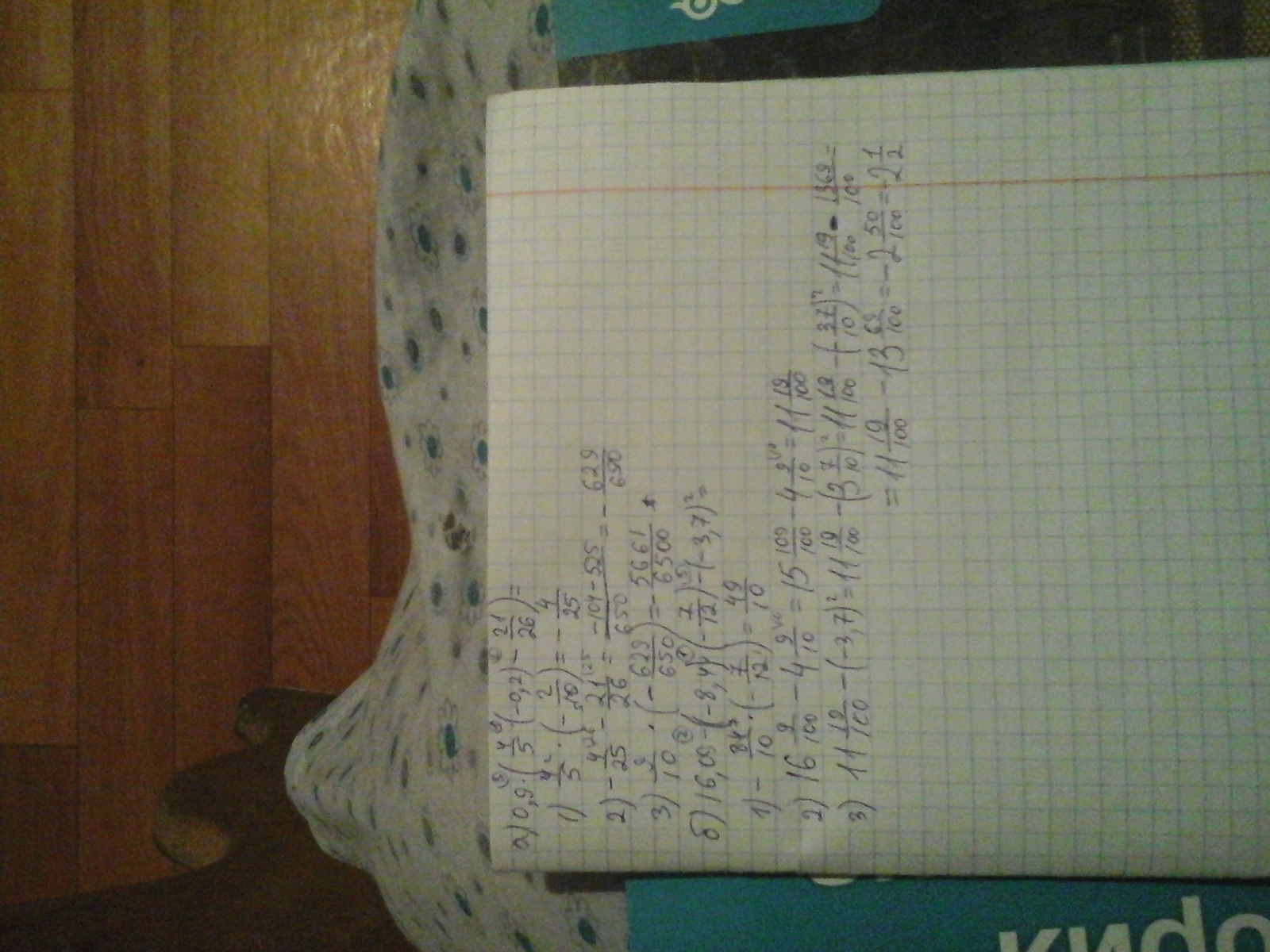 а) 12×(-17)= -204; б) -6,02×3,8=-22,876; в) -4,8×(-3,7)=17,76; г) -12/13×(-26/27)=8/9; д) -1 3/8×1 7/33= -11/8×40/33= -5/3= -1 2/3; е) 2 1/3×(-1 1/14)=7/3×(-15/14)= -5/2= -2 1/2; а) х^2-2/9,при х= -1:(-1)^2-2/9=1-2/9=9/9-2/9=7/9; при х=(-2/3): (-2/3)^2-2/9=4/9-2/9=2/9; б) 3-у^3,при у=(-3/5): 3-(-3/5)^3=3-(-27/125)=3+27/125=3 27/125; при у=(-1):3-(-1)^3=3-(-1)=3+1=4; при у =3-(-0,3)^3=3-(-0,027)=3+0,027=3,027