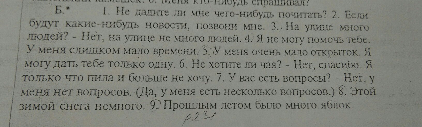 will you give me something to read? if there is any news, call me. Are there many people on the street? No, there are not many people on the street. I can't help you. I don't have time enough. I have very few postcards. I can take you only one. Do you want tea? No, thanks. I just drank and do not want to. Do you have any questions? (Yes, i have some questions) this winter a bit of snow. last summer there were a lot of apples