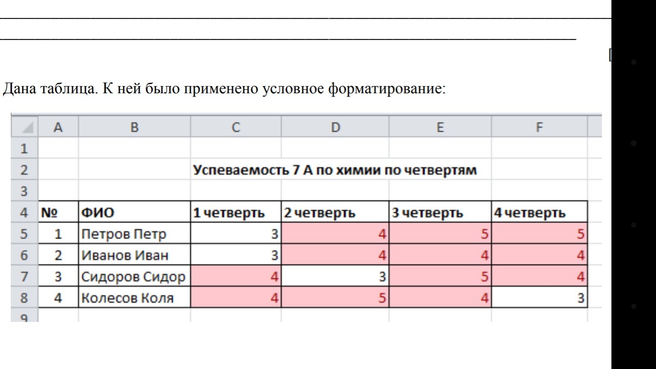 Срочно даю 20 БАЛОВ.Дана таблица.К ней было применнено условное форматирование.Запишите правило,согласно которому выполнено форматирование.