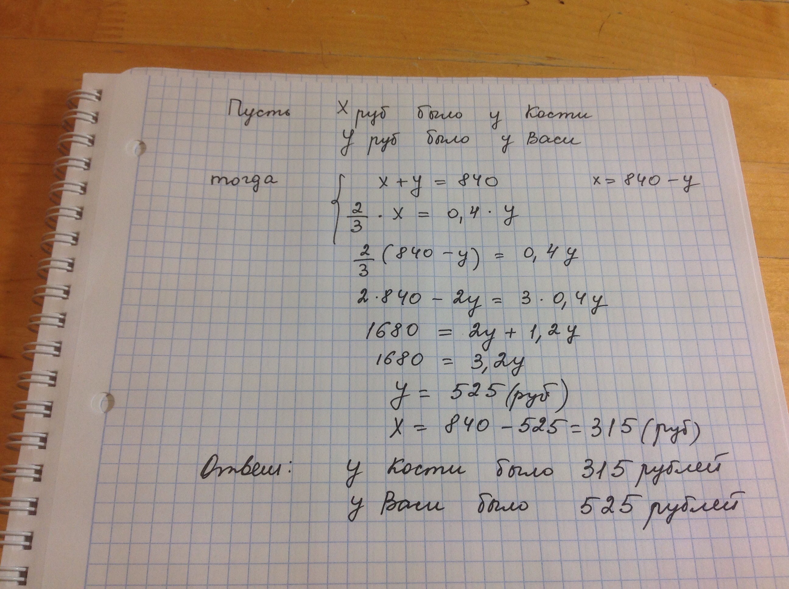 У Кости и Васи было 840 рублей.Они купили себе одинаковые альбомы , причём Костя потратил на альбом 23 своих денег ,а Вася 40% своих денег.Сколько рублей было у Кости и сколько у Васи?