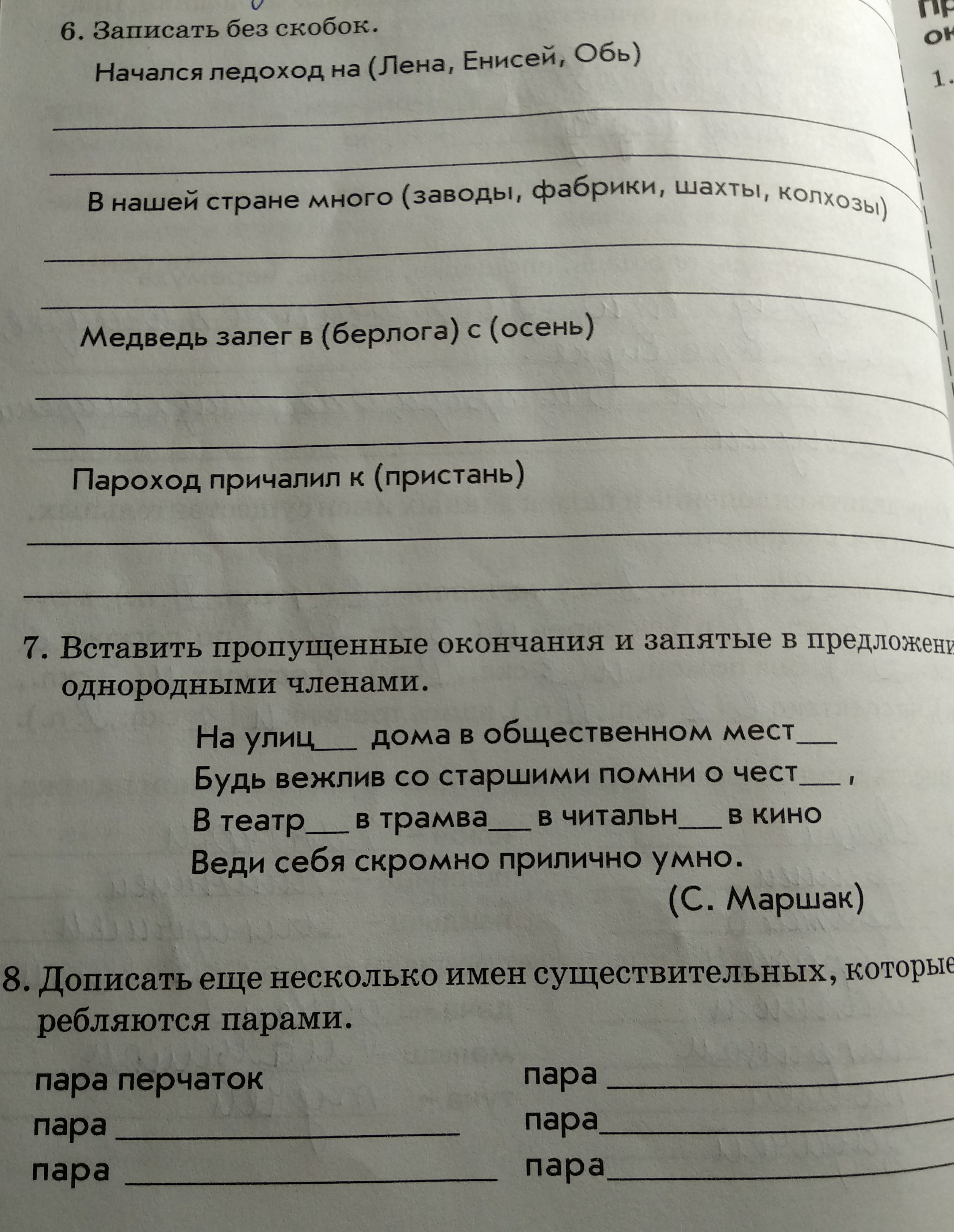 начался поход на Лену, Енисей и Обь. в нашей стране много заводов, фабрик ,шахт, колхозов. медведь залег в берлогу с осени. пароход причалил к пристани. следующая. пара перчаток, пара Носков, пара сапог, пара варежек, пары туфелек. Это был номер 8. следующая. на улице ,дома, в общественном месте, будь вежлив со старшими Помни о чести, в театре, в трамвае, в читальне, в кино, веди себя скромно прилично Умно. мне так кажется.