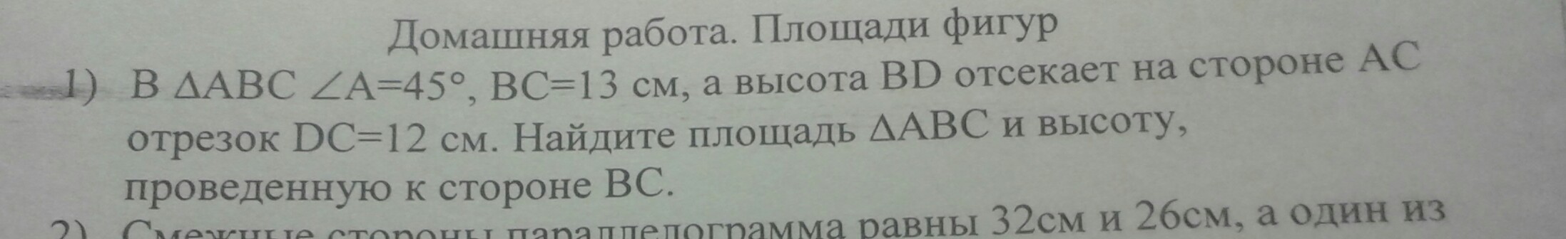 в треугольнике ABC,BC-13см, а высота BD отсекает на стороне AC отрезок DC-12см.найдите площадь ABC и высоту проведённую к стороне BC