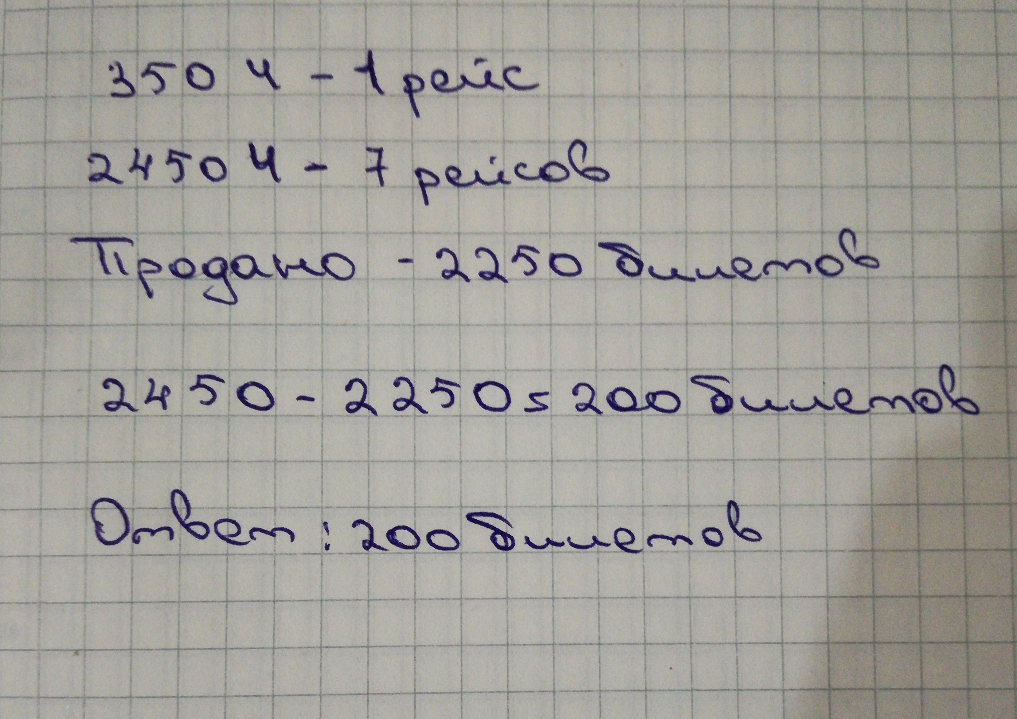 Самолёт Ил-86 может взять на борт 350 человек. На 7 рейсов этого самолёта продано 2250 билетов. Сколько билетов осталось продать на эти рейсы? Ребята пожалуйста помогите краткую запись составить)