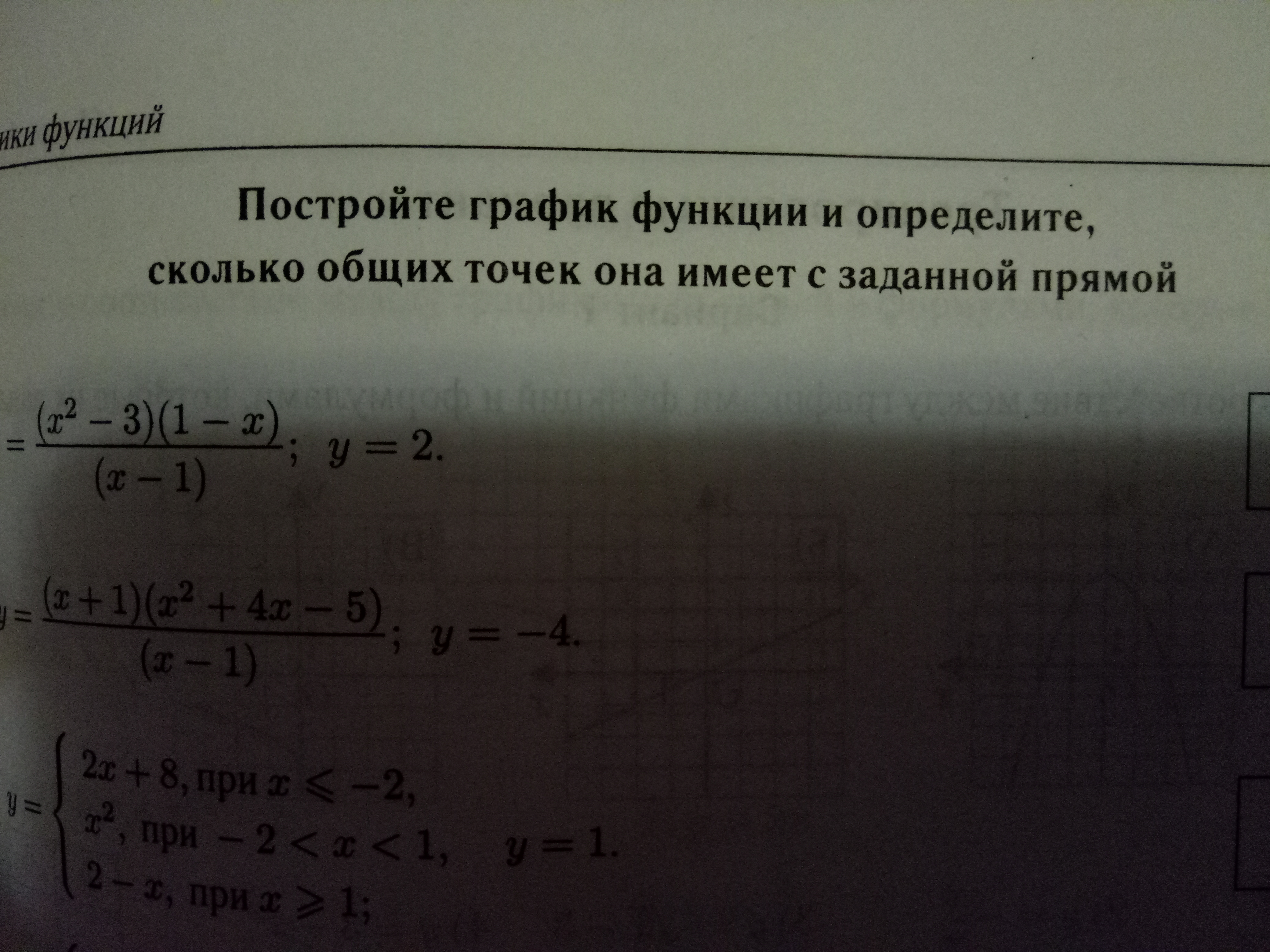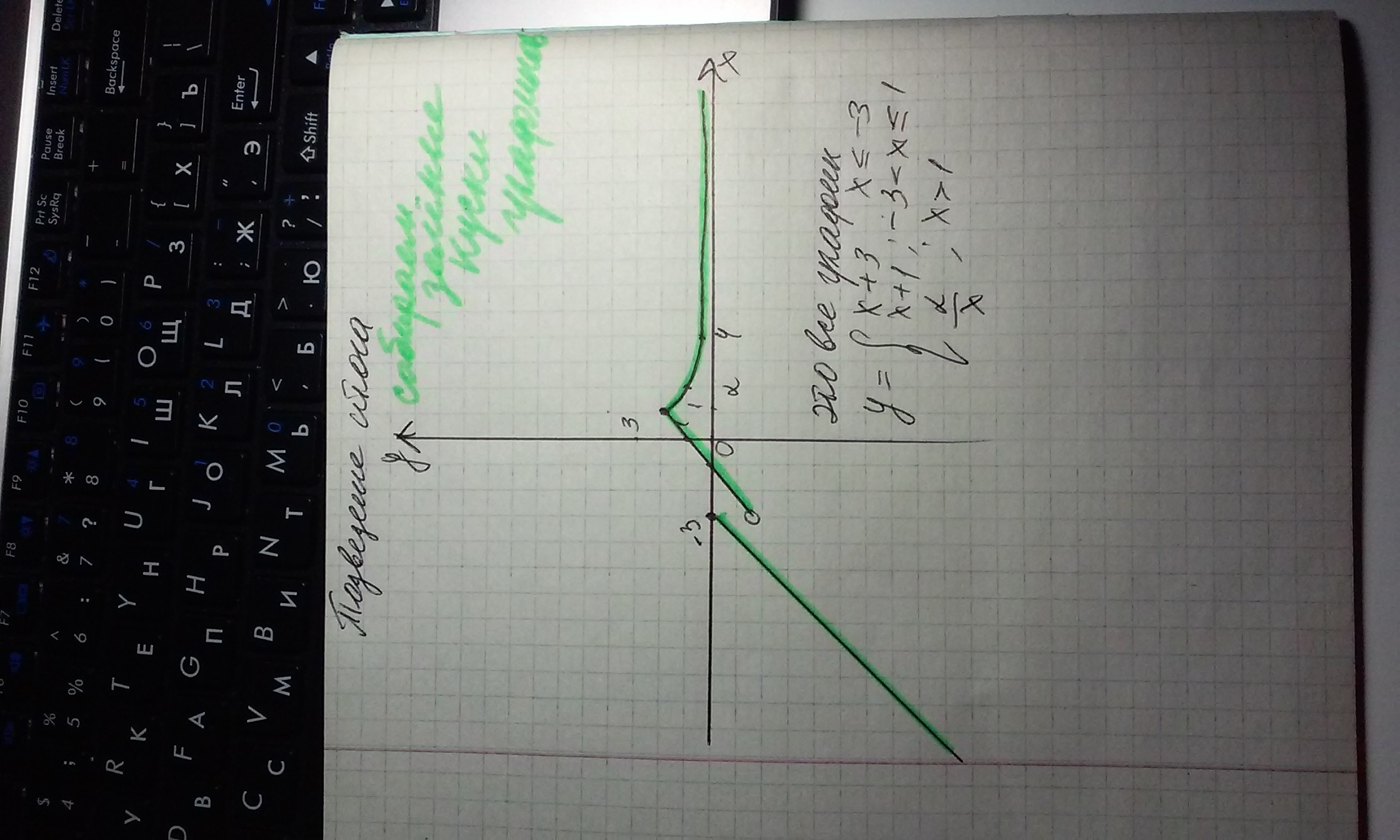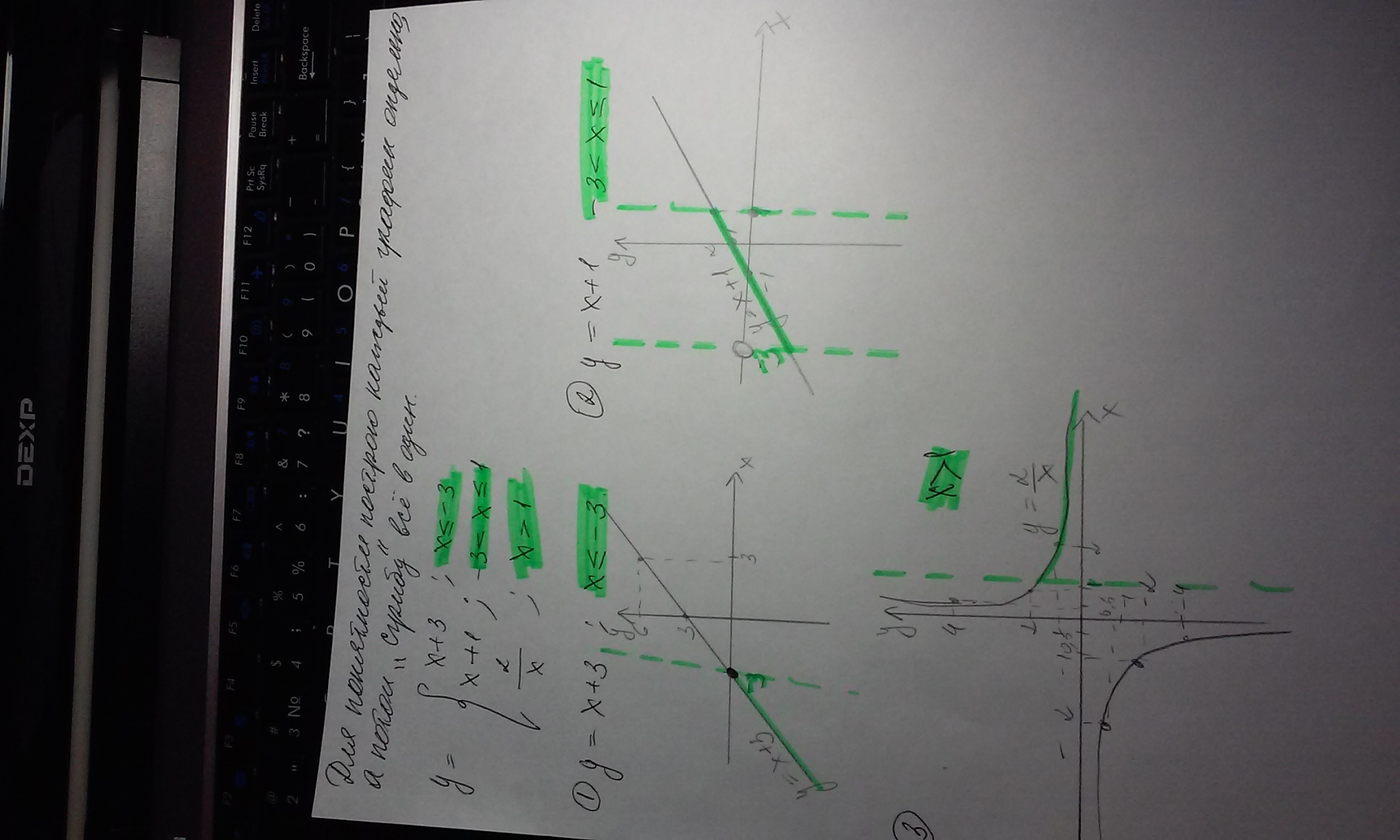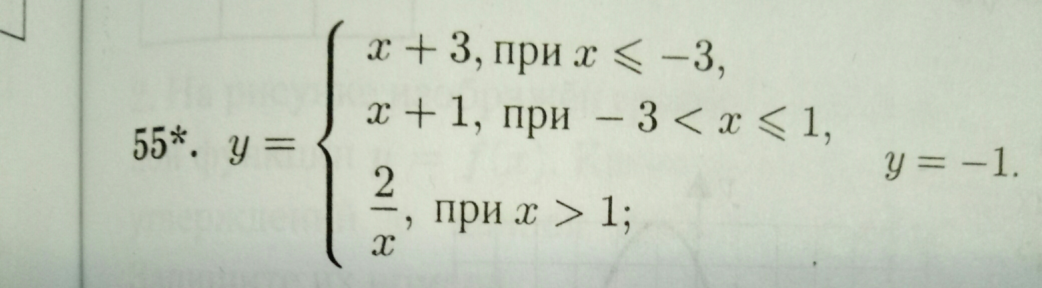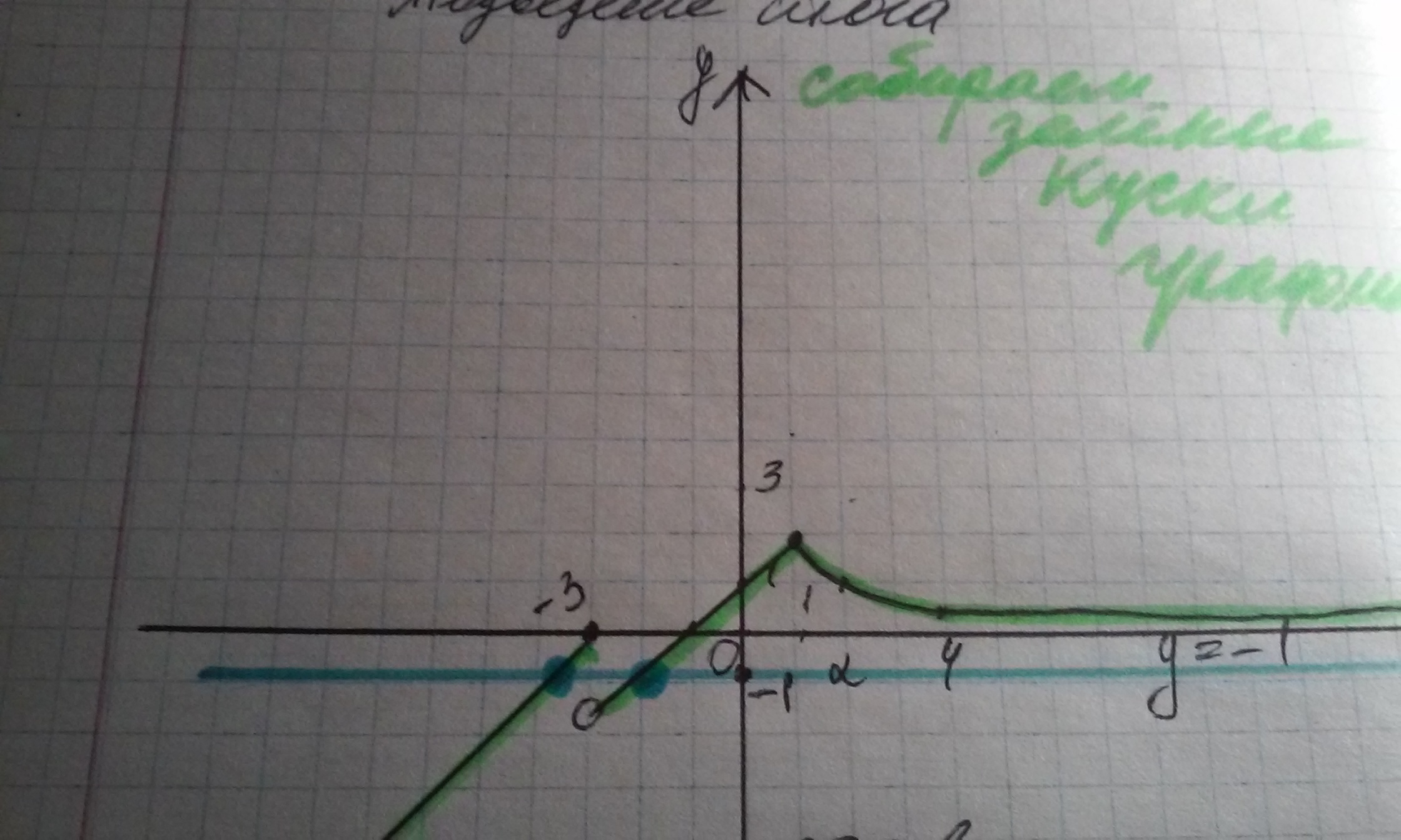 зелёный цвет показывает график с условием ( то что в условии написано (х>=-3) и др......),а то, что без цвета в принципе уже и не нужно. синий цвет показывает прямую у=-1 с ней пересекается 2 графика в двух точках
