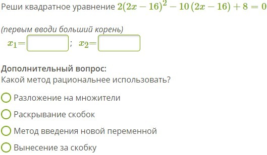 время решения методом внесения новой переменной и время вынесения за скобку будет примерно одинаковым. Но по логике,проще будет решать вынесением за скобку