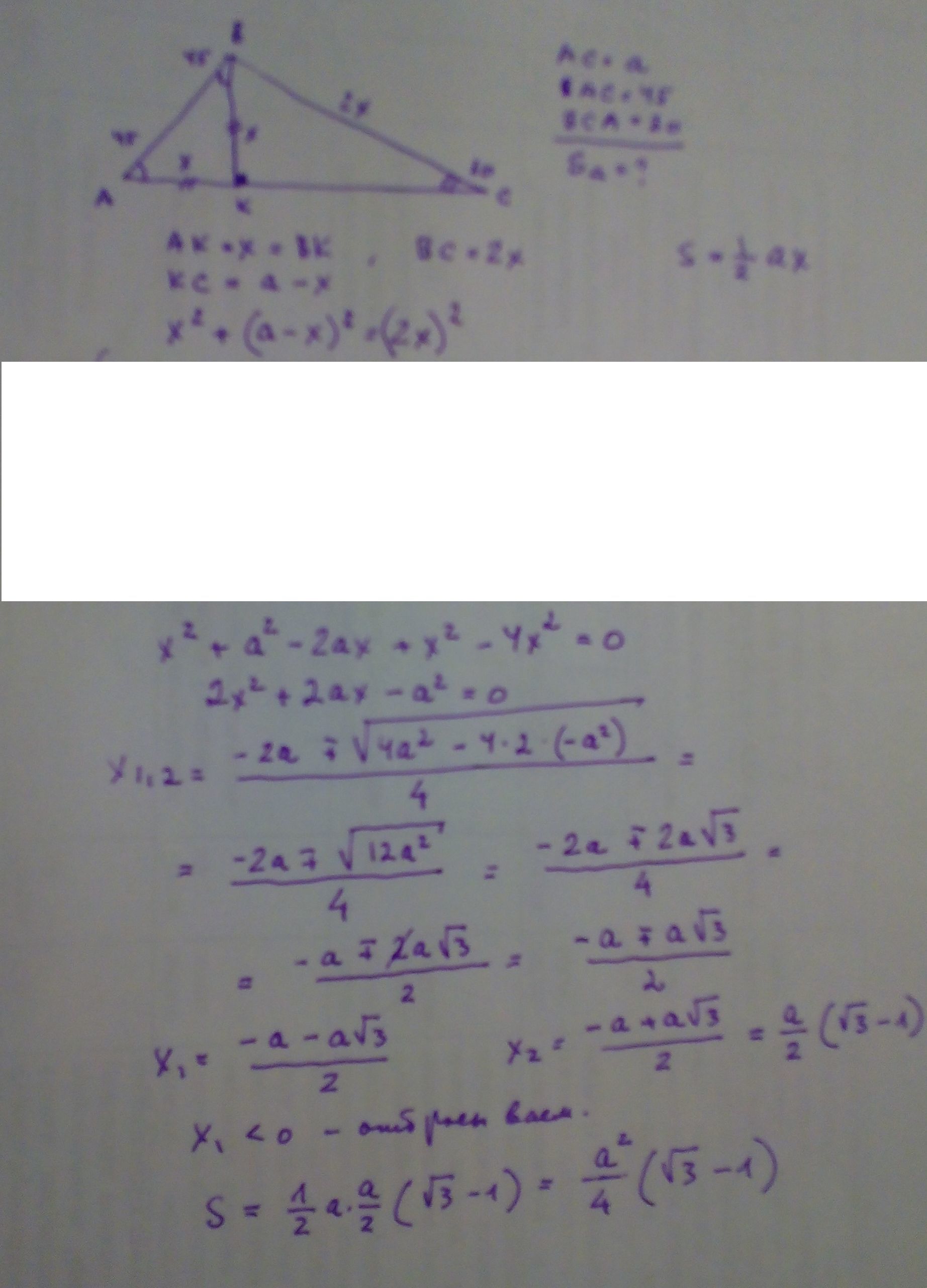 x^2 + (a-x)^2 = (2x)^2