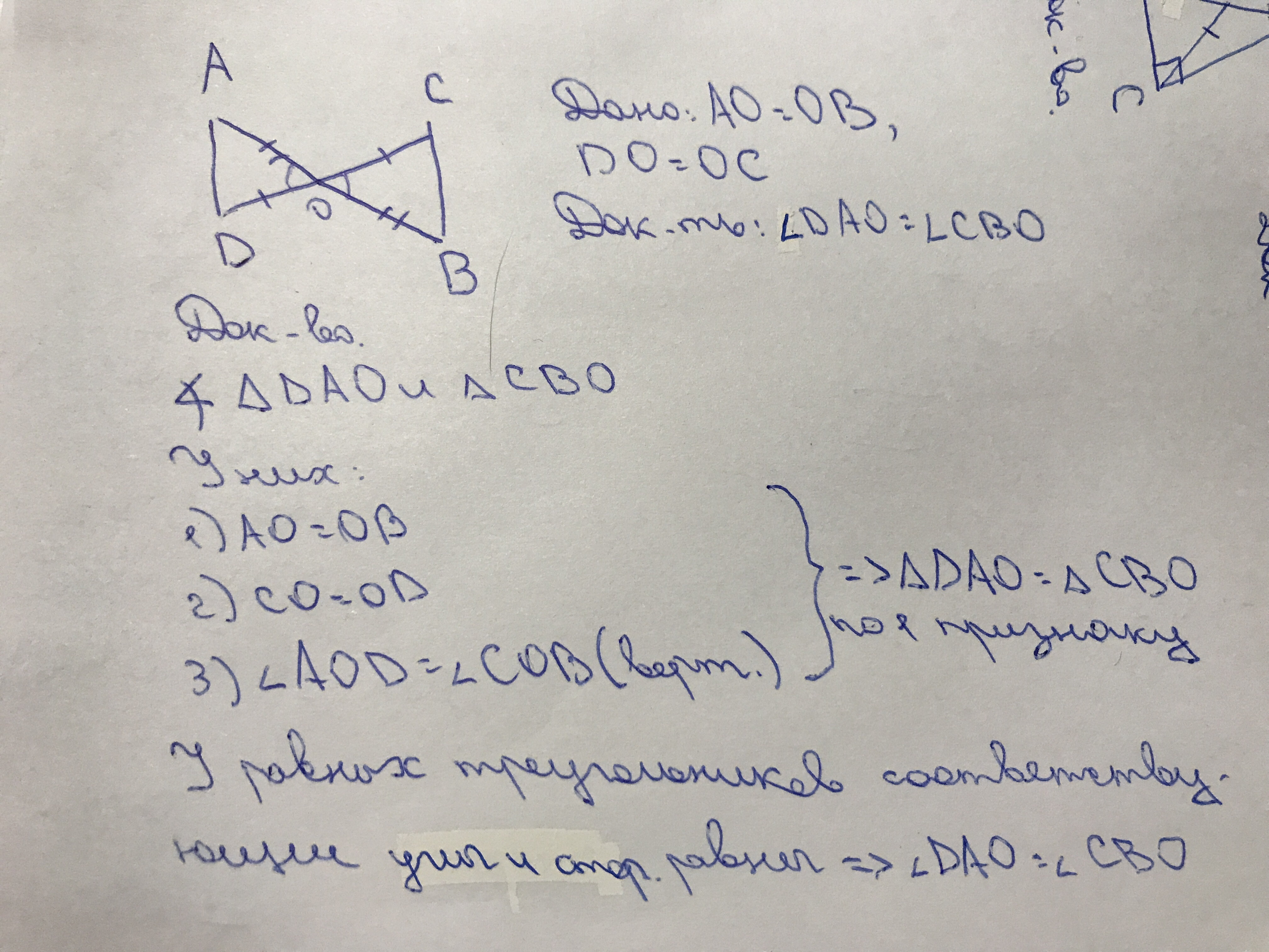 Отрезки AB и CD пересекаются в точке О и точкой пересечения делятся пополам. Докажите, что угол DAO равен углу CBO.