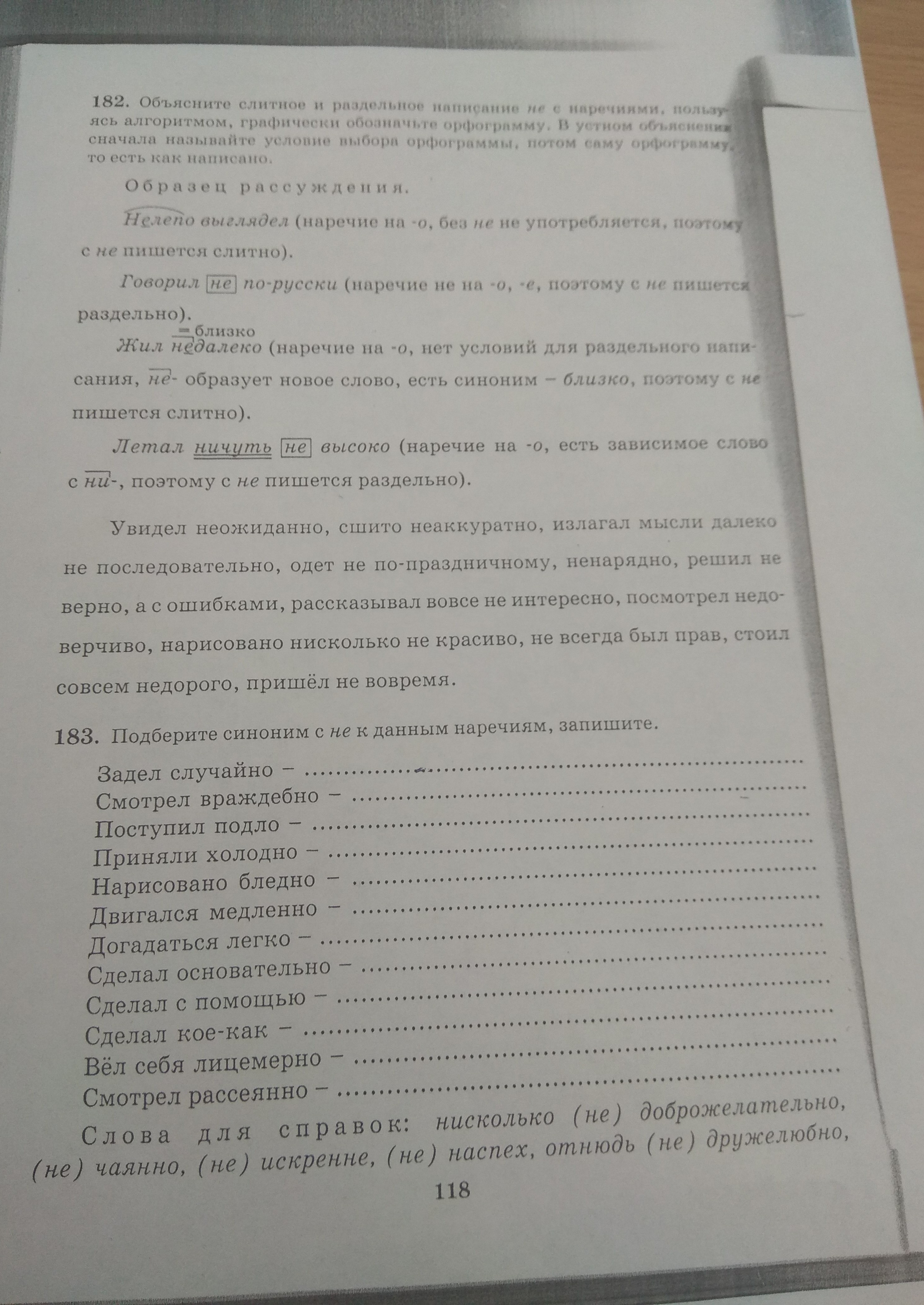 182. Увидел неожиданно (наречие на -о, нет условий для раздельного написания, -не- образует новое слово,есть синоним внезапно,по этому не пишется слитно).Сшито неаккуратно (наречие на -о, нет условий для раздельного написания, -не- образует новое слово,есть синоним небрежно,по этому не пишется слитно).Излагал мысли далеко не последовательно (слово далеко не усиливает отрицание,пишется раздельно).Одет не по-праздничному (наречие не на -о,-е,поэтому не пишется раздельно). Ненарядно (наречие на -о, нет условий для раздельного написания, -не- образует новое слово).Решил не верное , с ошибками(пишется раздельно потому что есть противопоставление с союзом а).Рассказывал вовсе не интересно (слово вовсе не усиливает отрицание,пишется раздельно).Посмотрел недоверчиво (наречие на -о, нет условий для раздельного написания, -не- образует новое слово).Нарисовано нисколько не красиво (слово нисколько не усиливает отрицание,пишется раздельно).Не всегда был прав (). Стоил совсем недорого (наречие на -о, нет условий для раздельного написания, -не- образует новое слово,есть синоним дешево,по этому не пишется слитно). пришел не вовремя ().