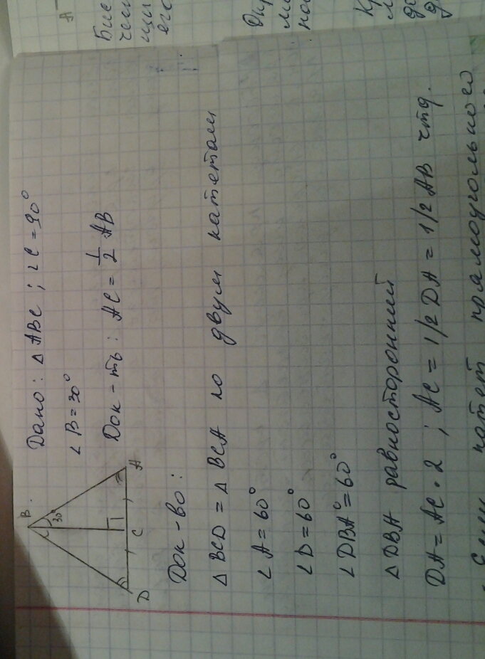 Докажите, что в прямоугольном треугольнике катет, лежащий против угла в 30 градусов, равен половине гипотенузы.