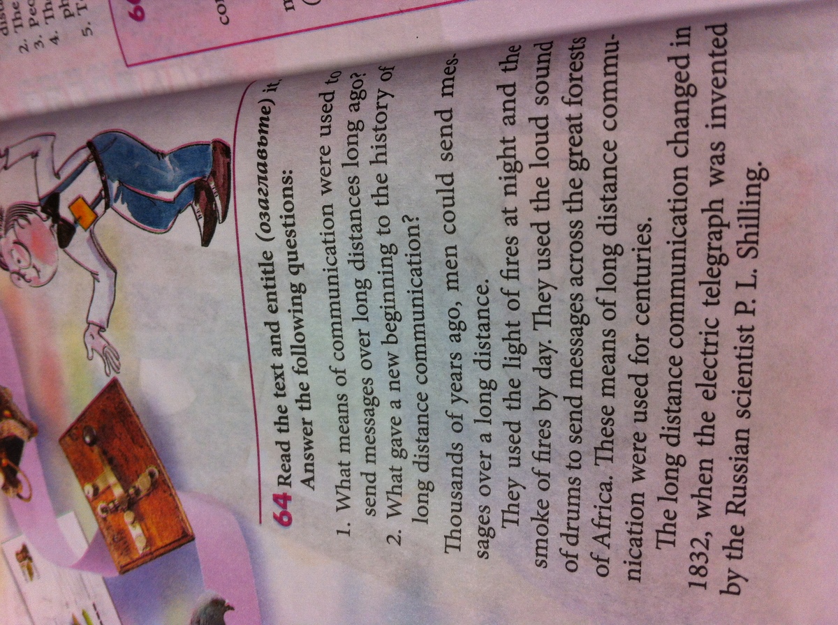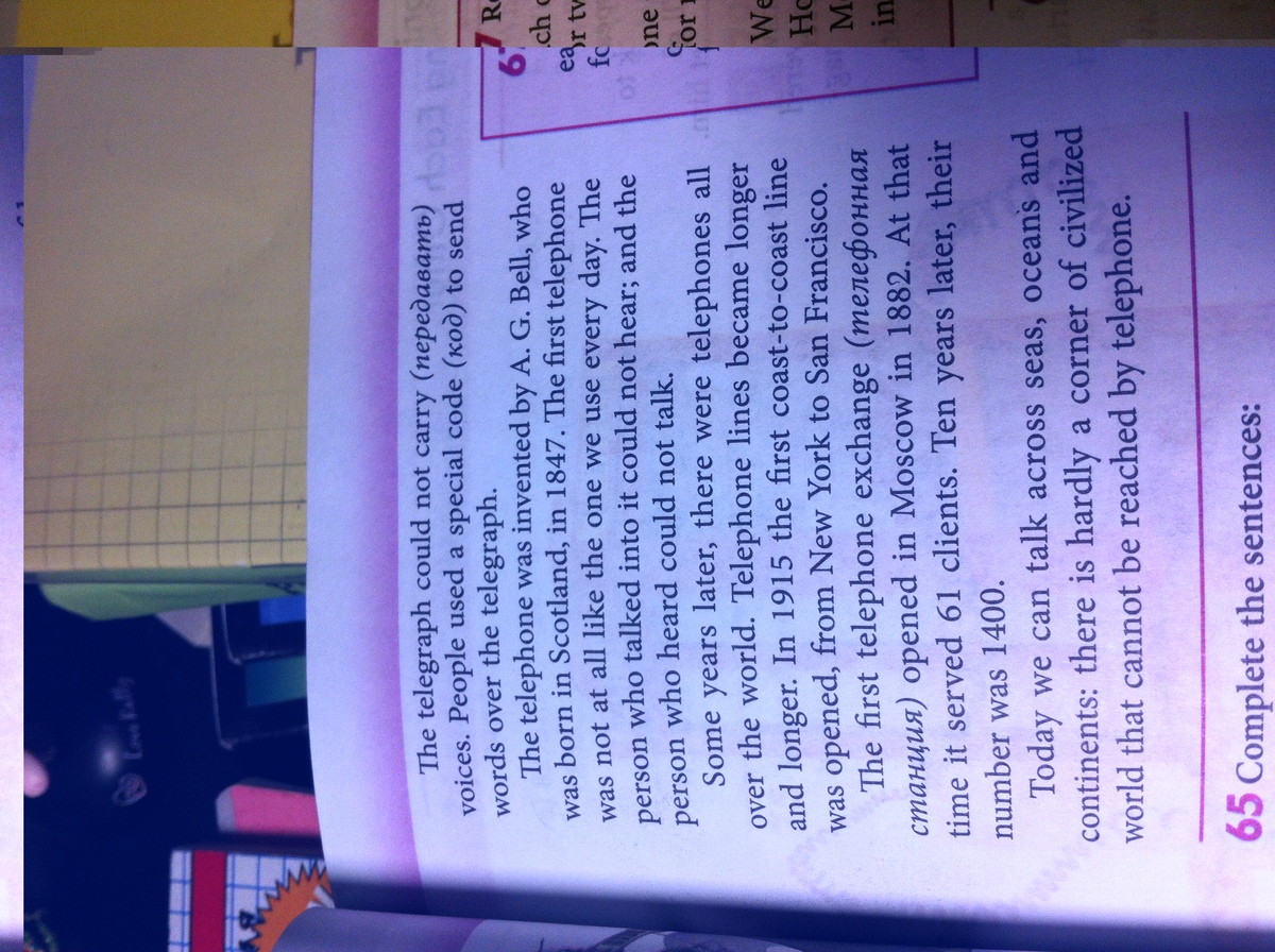 Телеграф не может передавать голос.Люди использовали специальный код чтобы посылать слова по телеграфу.Телеграф был изобретен Беллом А.Г. который родился в Шотландии в 1847. Первый телефон был похож на тот который мы используем каждый день. Человек который говорил по нем не мог слышать,а человек который слышал не мог говоритьНесколько лет спустя телефоны появились по всему миру.Телефонные линии стали все длиннее и длиннее.А в 1915 году появилсь первые береговые линии от нью йорка до санфранциско.Первая телефонная станция была открыта в Москве в 1882.В это время работало 61 клиент. А 10 лет спустя их стало 1400.Сегодня мы можем пересеч моря океаны континенты. И трудно сейчас найти уголок цивилизации который не был бы богат телефоном.