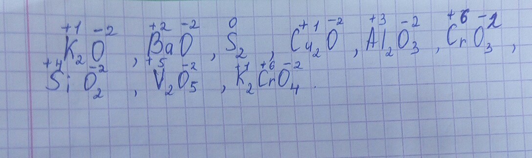 определите степень окисления атомов химических элементов в следующих соединениях: K2O, BaO, S2, Cu2O, Al2O3, CrO3, SiO2, V2O5, K2CrO4