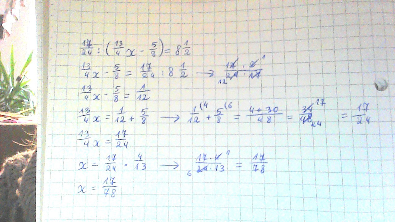 Решение на фото. Там где идёт действие 17/24 : 8 1/2 можно сразу написать 17/24 * 2/17