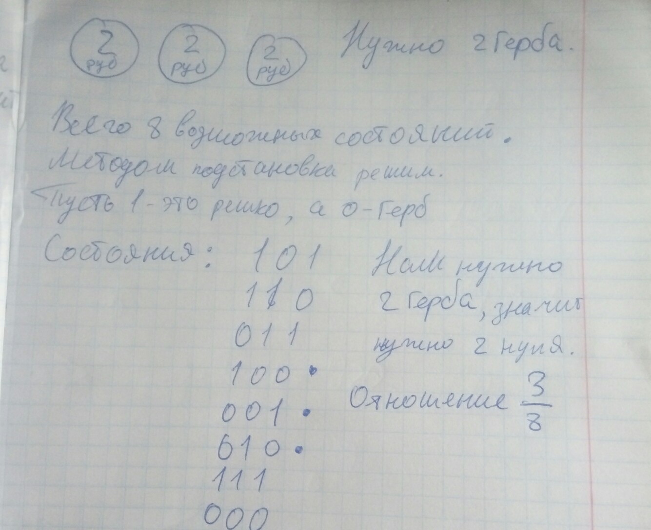 Найти вероятность того, что при бросании трёх монет выпадает два герба