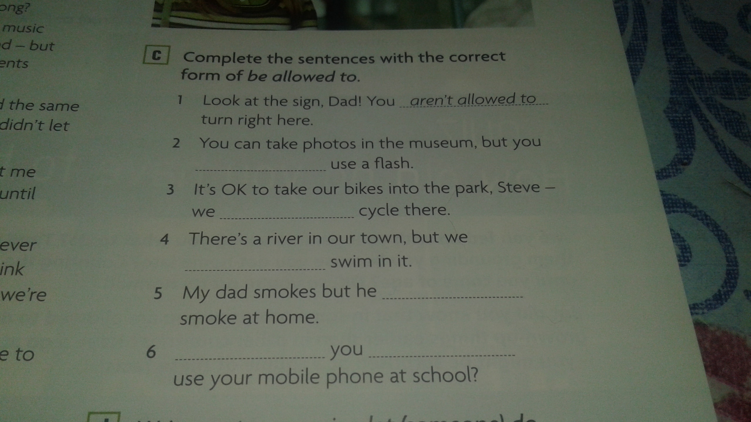 2- aren't allowed to. 3-are allowed. 4-aren't allowed. 5-isn't allowed to. 6-Are you allowed to