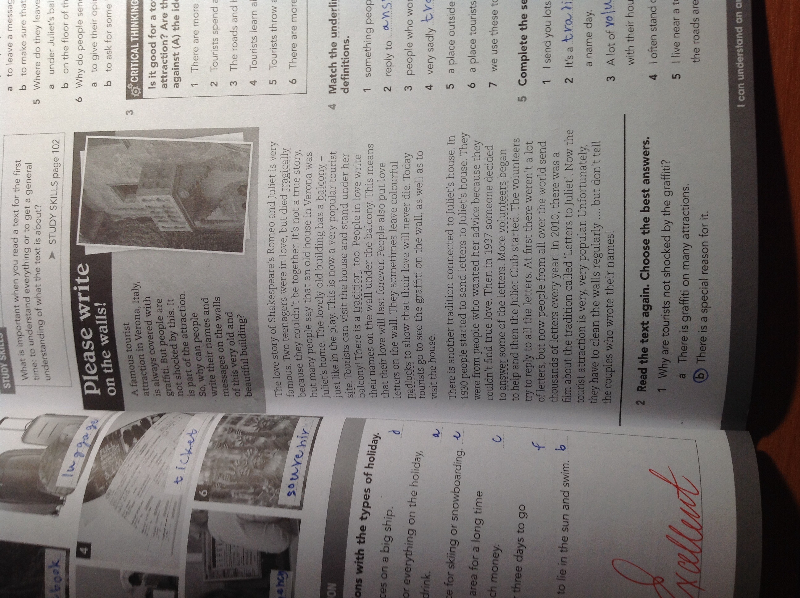 Плохо видно Первое а второе Был ли дом действительно2 Жюльеном дома? A Нет, потому что она не была настоящим человеком. B Да, потому что Шекспир сказал, что это так. 3 Что случилось с Ромео и Мет? A Их любовь длилась очень долго. B Они сильно отличаются друг от друга 4 Зачем люди пишут на стене? A оставить сообщение для туристов, B чтобы убедиться, что их любовь продолжается 5 Где они оставляют письменные заметки? A на балконе B Juliets на боку courtyrd 6 Почему люди посылают письма в дом Мец? A дать свое мнение о туристической привлекательности B, чтобы спросить о каком-то хеле