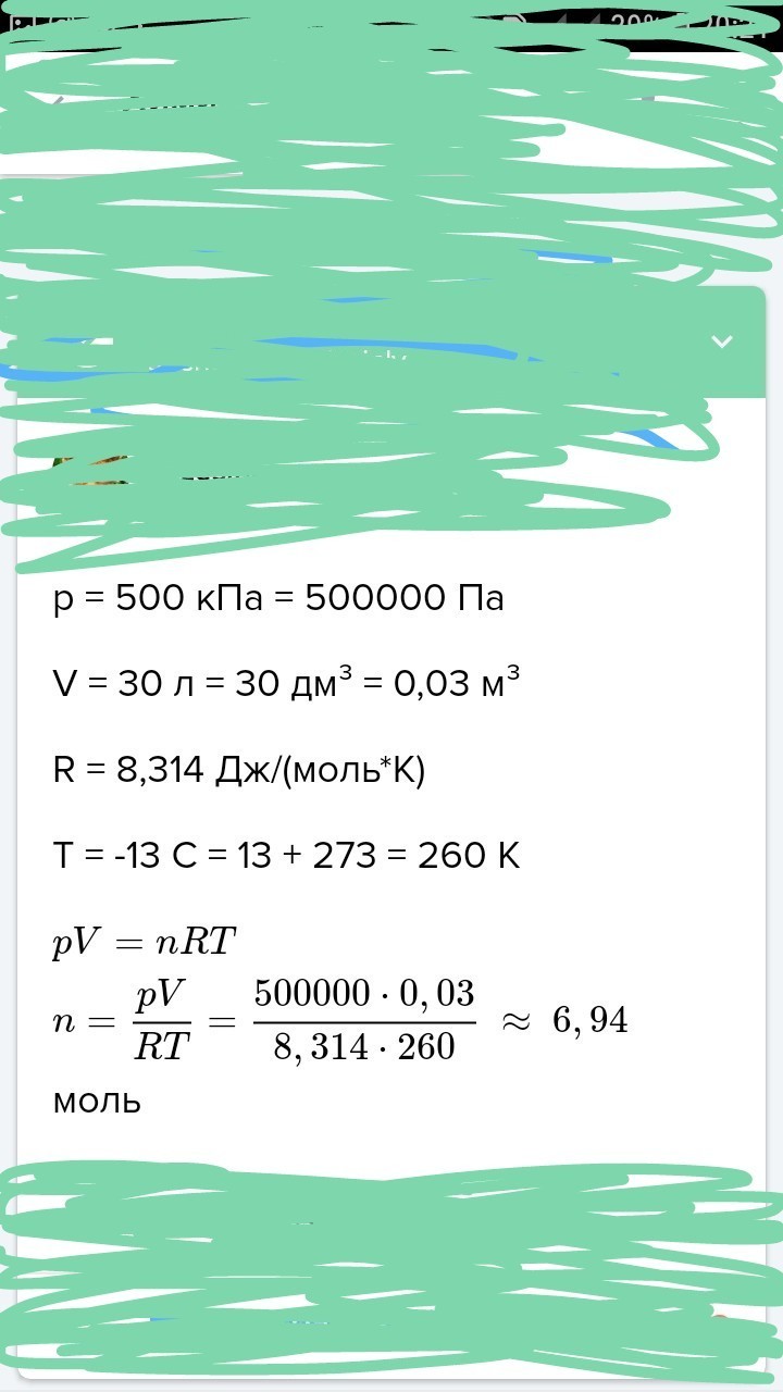 найти количество вещества в газе , если при температуре -13 градусов и давление 500 кПа объем газа равен 30 л