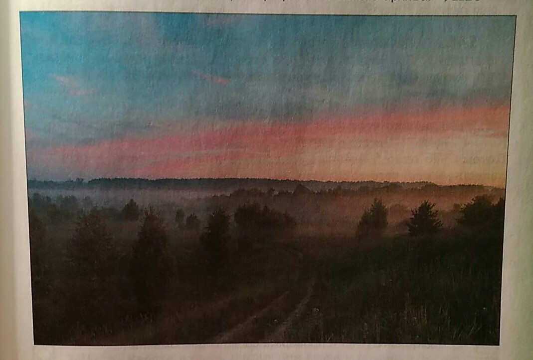 На картине изображен закат и длинная дорога . Небо красное и бирюзовое.Слева и справа дороги-лес. Над ним густой туман.Лес стал черный.