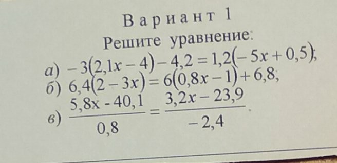 б) 6,4(2-3х) = 6(0,8х-1)+6,8