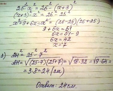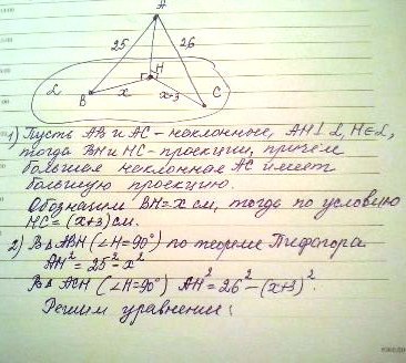 из точки к плоскости проведены две наклонные =25 и 26см найите расстояние от этой точки до плоскости если разность длин проекций этих отрезков на плоскость равна 3см выполните чертёж