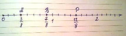 Постройте на координатном луче точки A(три восьмых),B(семь восьмых),C(восемь восьмых), P(двенадцать восьмых)