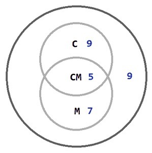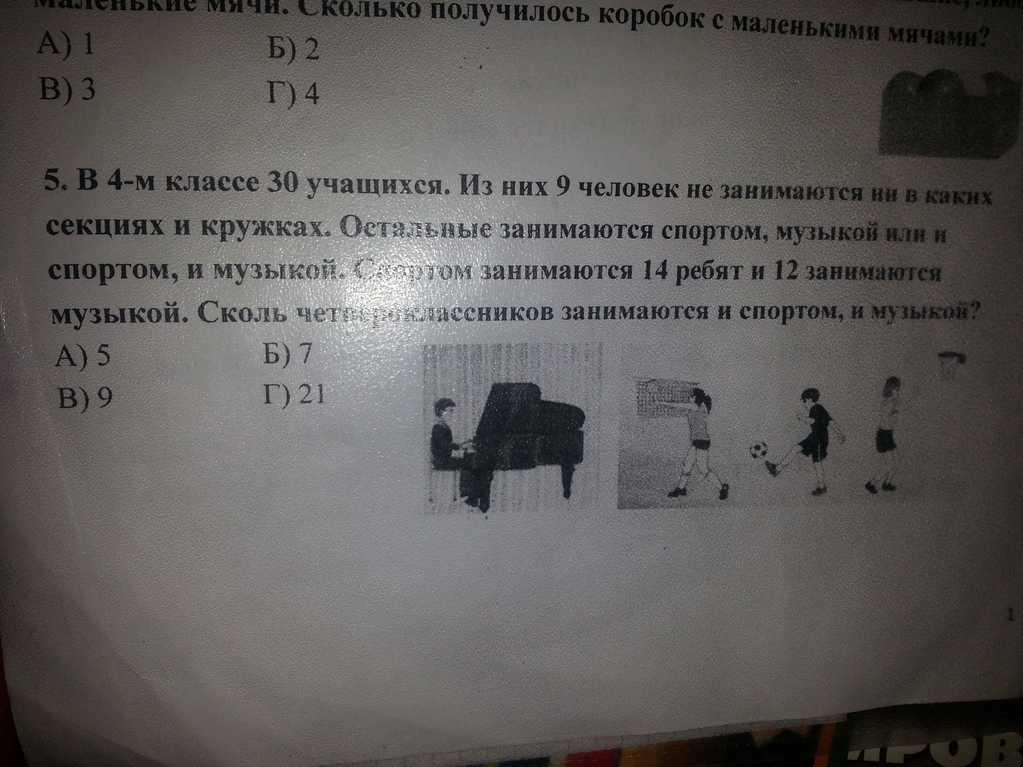 В 4 классе 30 учащихся. Из них 9 человек не занимаются ни в каких секциях и кружках. Остальные занимаются спортом, музыкой или и спортом и музыкой. Спортом занимаются 14 ребят и 12 занимаются музыкой. Сколько четверо классиков занимаются и спортом и музыкой? ПОМОГИТЕ ПОЖАЛУЙСТА РЕШИТЬ!