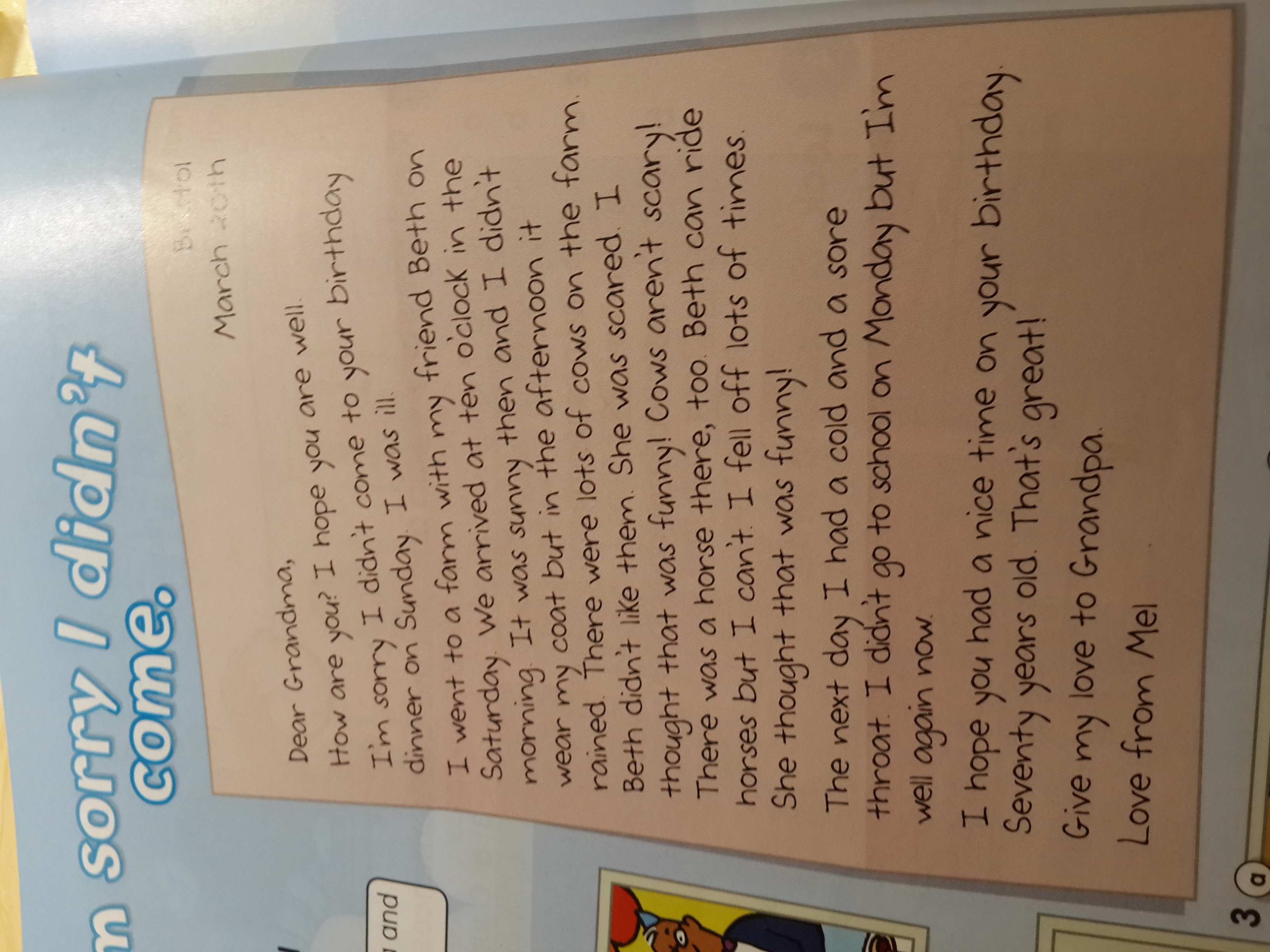 ИзвинитеДорогая бабушка, хорошо. Как дела? Надеюсь, ты на день рождения и не пришел на свой ужин в воскресенье. Я был болен на ферме с моим другом Бет. В субботу мы прибыли в воскресенье в десять утра. Я не был утром. Это было и пальто в названии было много коров на ферме, но Бет не ждал их. Она была забита. Думала, что это забавно. Коровы - это не шрам. Там был, тоже Бет может кататься на лошадях, но я не могу отвалить много раз. Она думала, что это смешно! На следующий день у меня был холод и боль в горле, я не ходил в школу в понедельник, но теперь я снова верю, что надеюсь, что у вас было приятное время на твои годы рождения. Это великолепие. Подари мне любовь к дедушке любви от Мела.Вроде бы всё перевела