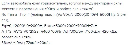 Какую работу выполнила сила тяги автомобиля массой 2т,если за 4 с скорость его движения возросла с 36 км/ч до 72 км/ч?Коэффициент трения составляет 0.1