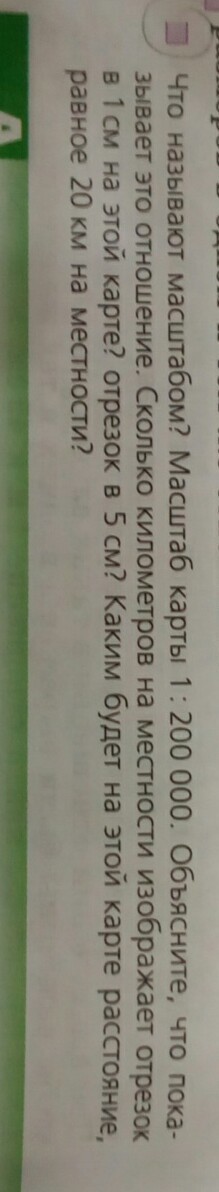 масштаб карты 1 к 200000. объясните что показывает это отношение. Сколько километров на местности изображает отрезок в 1 см на этой карте? отрезок 5 см? каким будет на этой карте расстояние равное 20 км на местности?