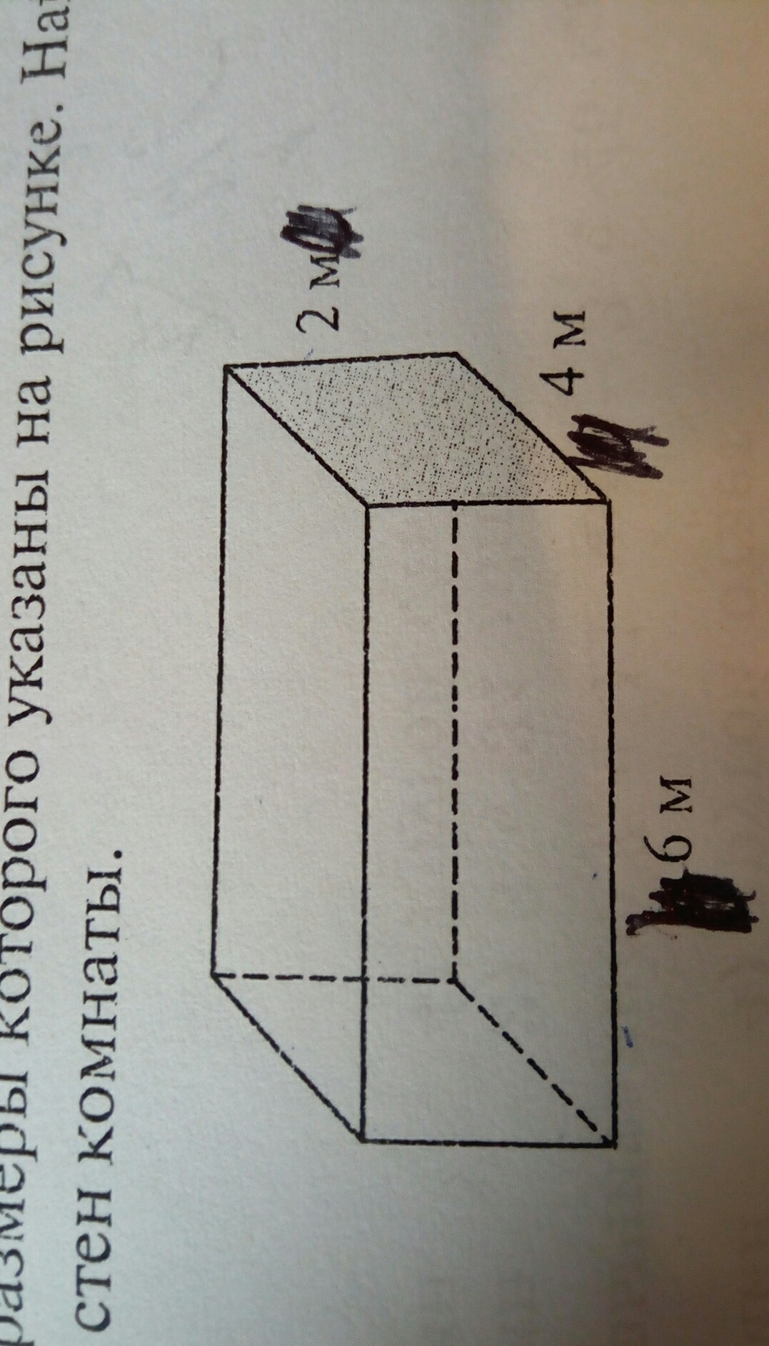комната имеет форму прямоугольного параллелепипеда размеры которого указаны на рисунке. Найдите площадь стен комнаты.