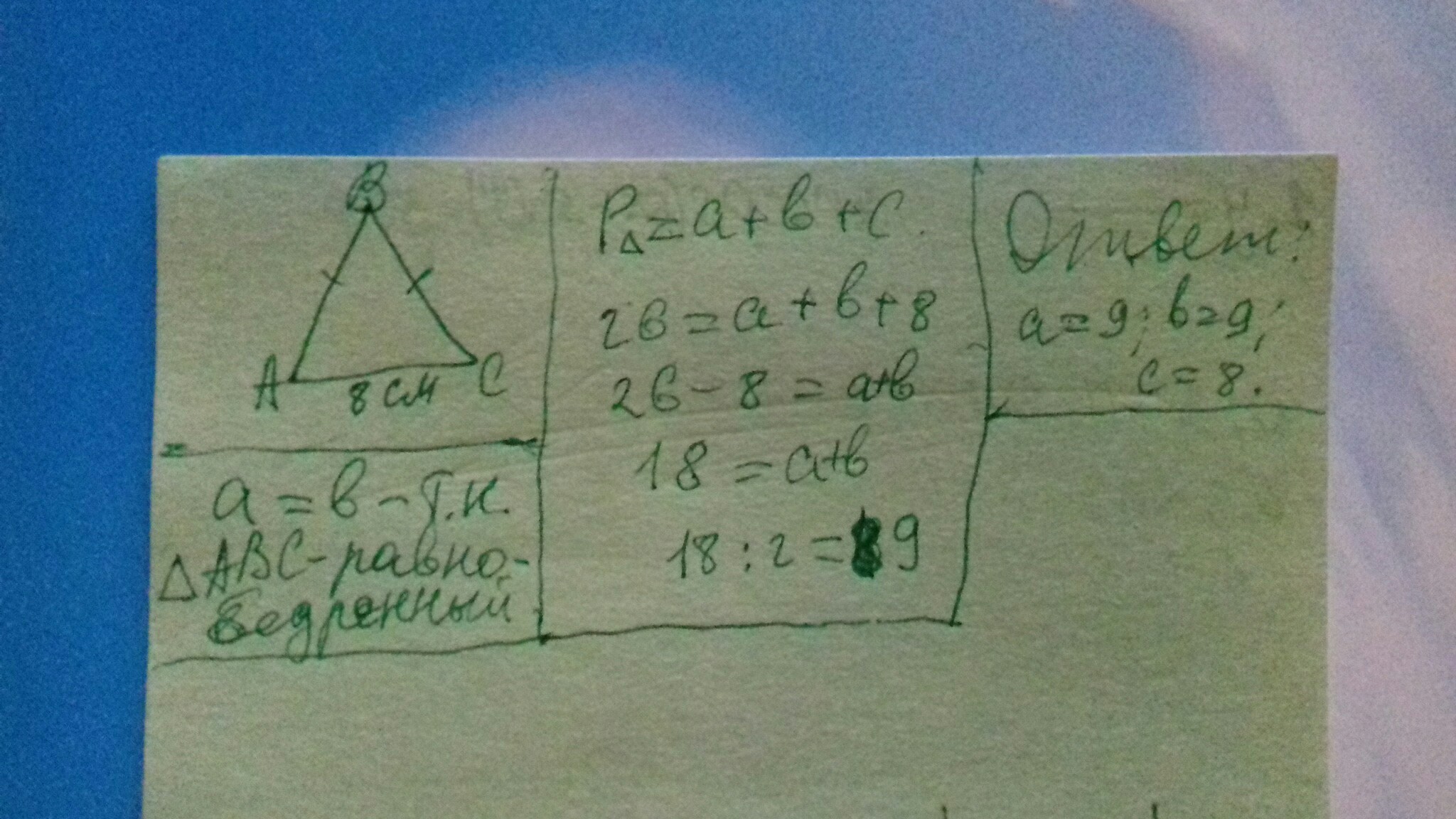 задача: Задан равнобедренный треугольник, периметр которого 26 см. определите стороны треугольника, если его основание 8 см.