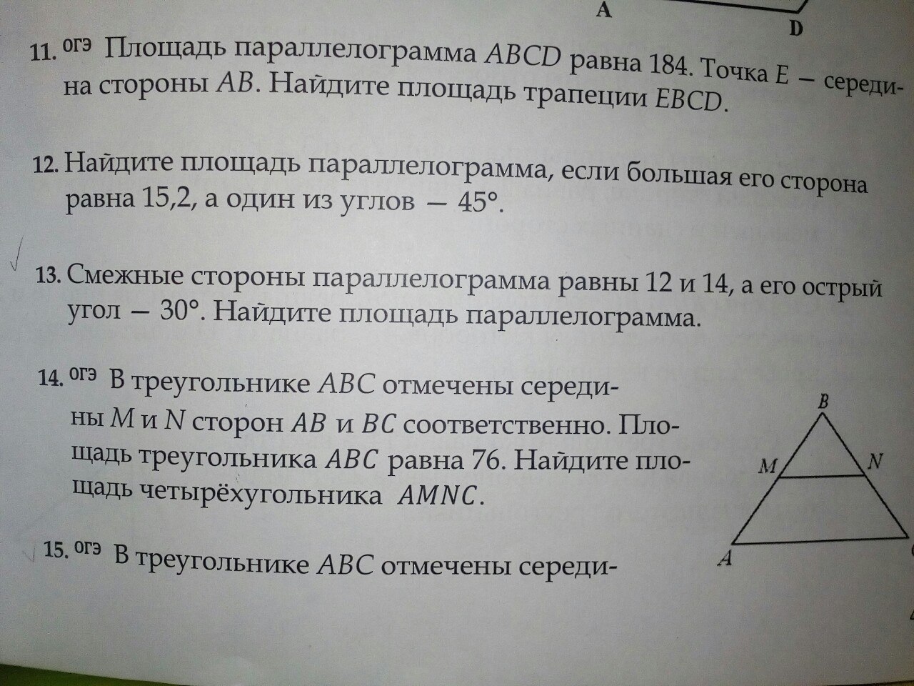 В треугольнике АВС отмечены середины М и N сторон АВ и ВС соответственно. Площадь треугольника BNM равна 12. Найдите площадь четырехугольника AMNC.