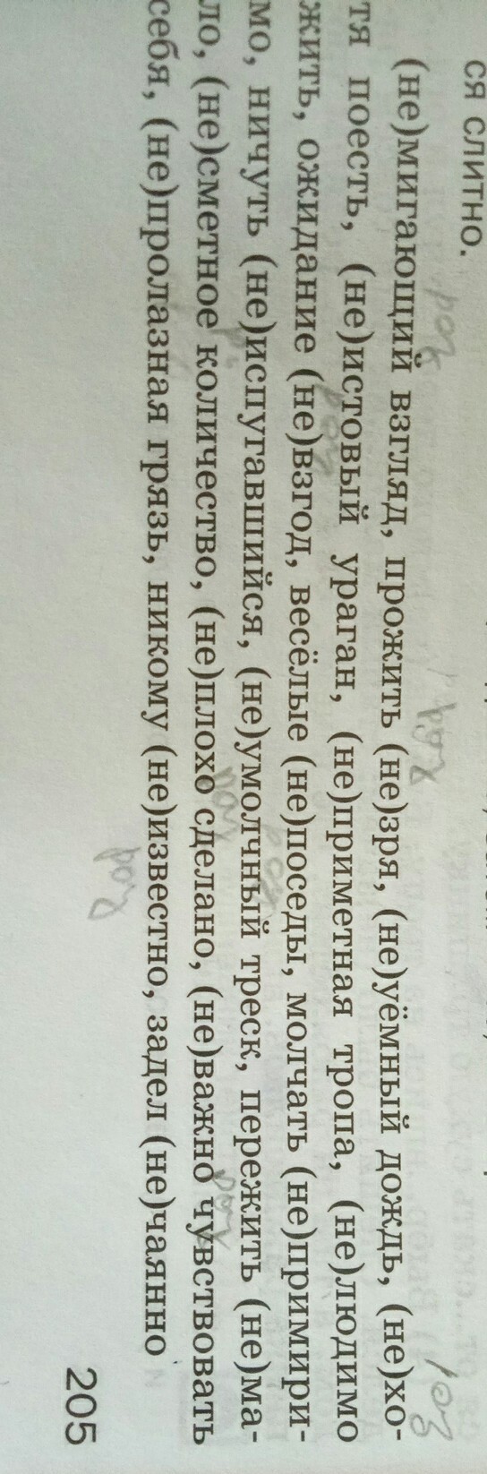 Немигающий взгляд,прожить не зря ,неуёмный дождь,нехотя поесть,неистовый ураган,неприметная тропа,нелюдимо жить, ожидание невзгод, весёлые непоседы, молчать непримиримо, ничуть не испугавшийся, неумолчный треск, пережить немало, несметное количесво, неплохо сделано, неважно чувствовать себя, непролазная грязь, никому не известно, задел нечаянно.
