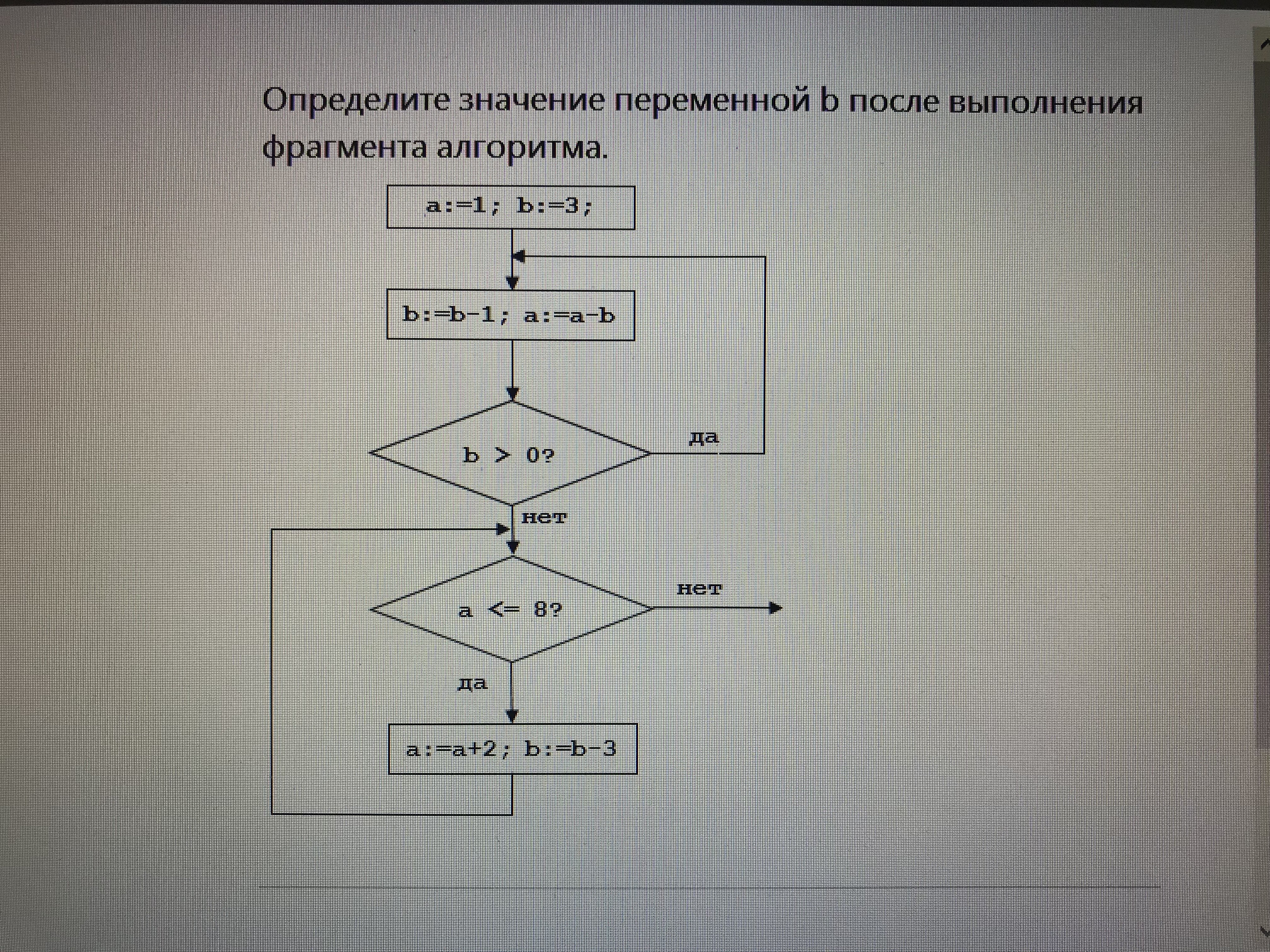 javascript:var a=1,b=3;do{b--;a-=b;}while(b>0);while(a<=8){a+=2;b-=3;}alert(b);