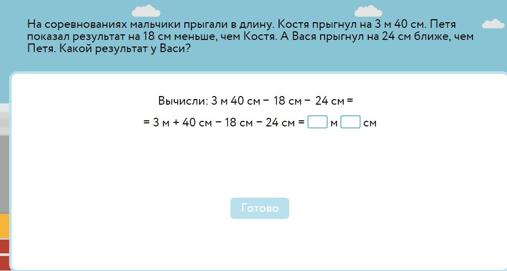 1)340 см- 18 см= 322 (см)-прыгнул Петя