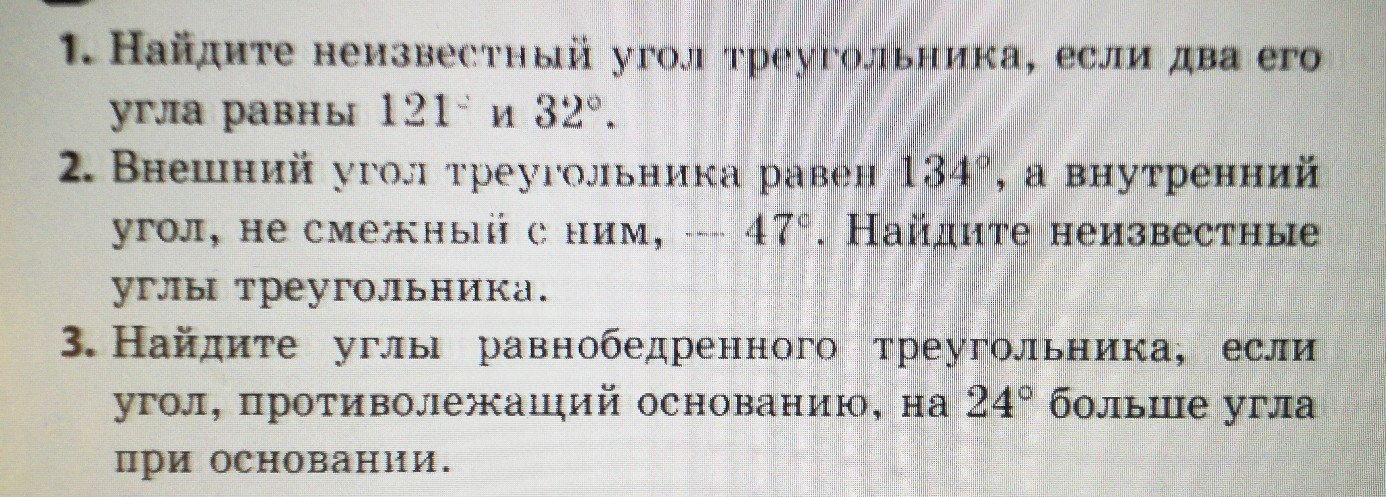 1. По теореме сумма углов треугольника равна 180 градусов, следовательно, неизвестный угол равен: 180-121-32=27 градусов.