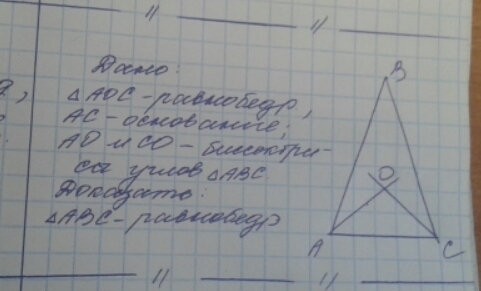 Дано: тр. ADC - равнобедоенный. AC - основание. AO и CO биссектрисы углов треугольника ABC. Доказать: тр. ABC - равнобедренный