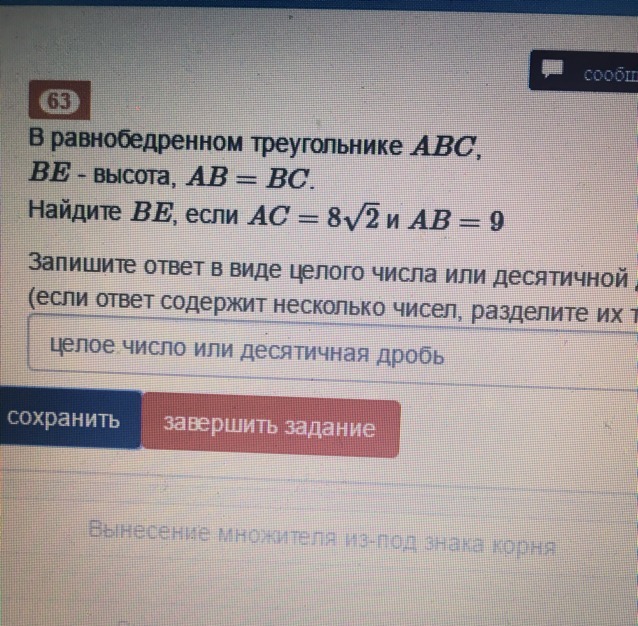 По Теореме Пифагора решаем 81-32=49, корень квадратный равен 7=BE
