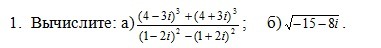 комплексные числа, вычислить ((4-3i)^3+(4+3i)^3)/((1-2i)^2-(1+2i)^2) и корень(-15-8i)