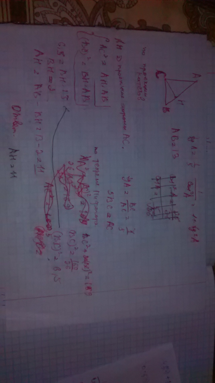 Объясните алгоритм решения таких заданий, очень подробно, если можно, вычислить косинусы синусы углов знаю как, а вот с таким торможу В треугольнике ABC угол C равен 90 градусов, CH - высота, AB равна 13, tgA равен 1/5. Найти AH