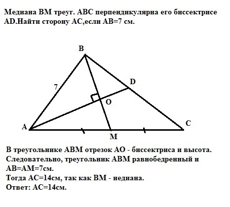 Медиана BM треуг. АВС перпендикулярна его биссектрисе AD.Найти сторону АС,если АВ=7 см.