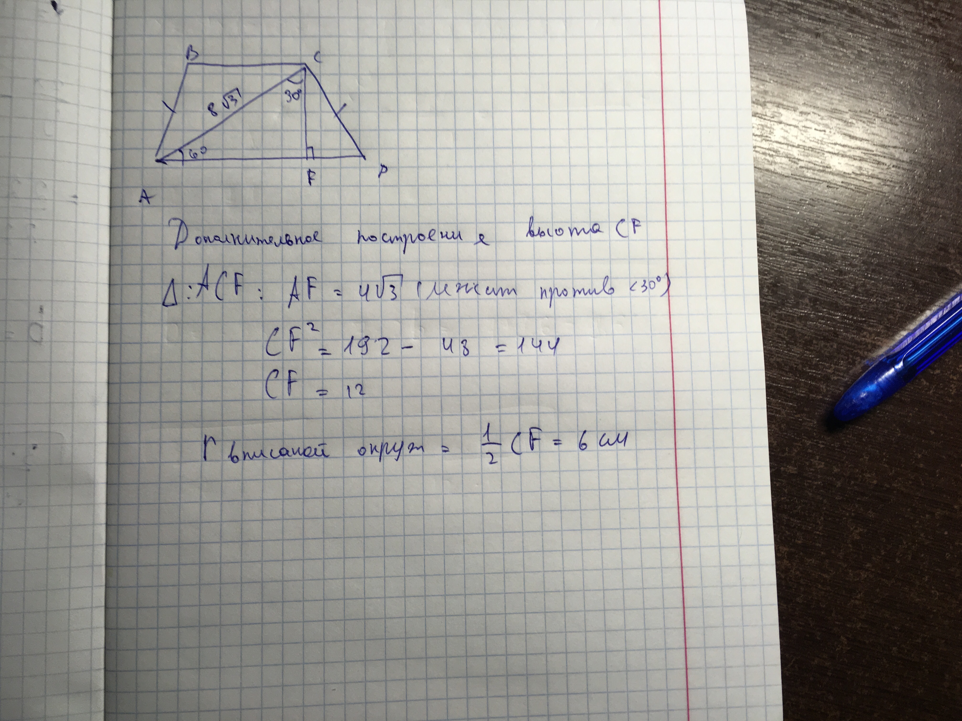 В равнобедренной трапеции диагональ AC=8√3 образует с большим основанием AD угол 60°. Найдите радиус вписанной окружности.