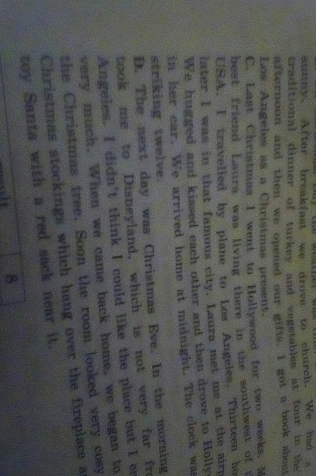 D. На следующий день был канун Рождества. Утром Лаура отвезла меня в Диснейленд, который расположен недалеко от Лос-Анджелеса. Я не думал, что мне так понравится это место. Я получил огромное наслаждение. Вернувшись домой, мы принялись наряжать рождественскую елку. Спустя некоторое время комната стала выглядеть уютной и украшенной рождественскими чулками, развешанными над камином (не видно что написано, дальше речь идет об игрушечном Санте с красным мешком).