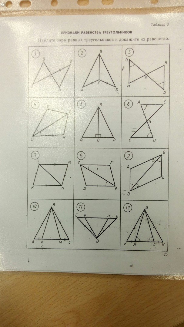 найдите пары равных треугольников и докажите их равенство таблица 2 , рисунок 11 и 12
