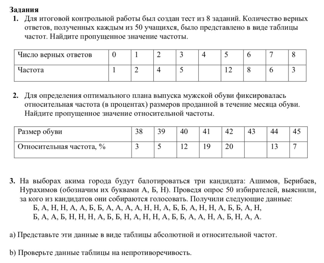 Для итоговой контрольной работы был создан тест из 8 заданий.Количесвто верных ответов,полученных каждый из 50 учащихся, было предоставлено в виде таблица частот.Найдите пропущенные значения частот.